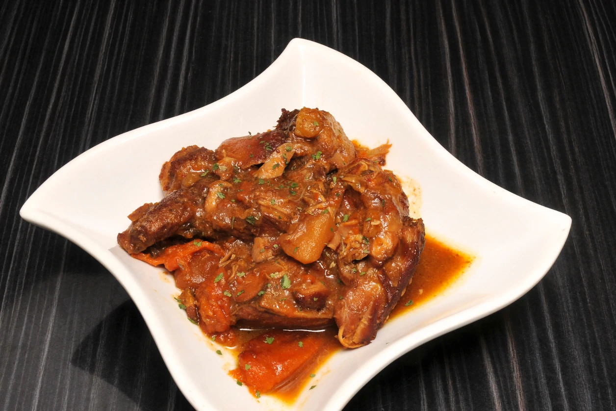 Marinated Chicken stewed in its own juices, with onion and tomatoes.